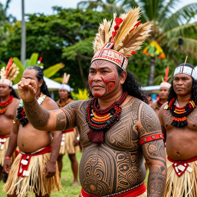 Polinesian cultural festival scene, vibrant traditional tattoos, lush tropical background, warriors in ceremonial attire, detailed facial expressions, island paradise atmosphere, bright colors and intricate patterns, realistic style with high detail