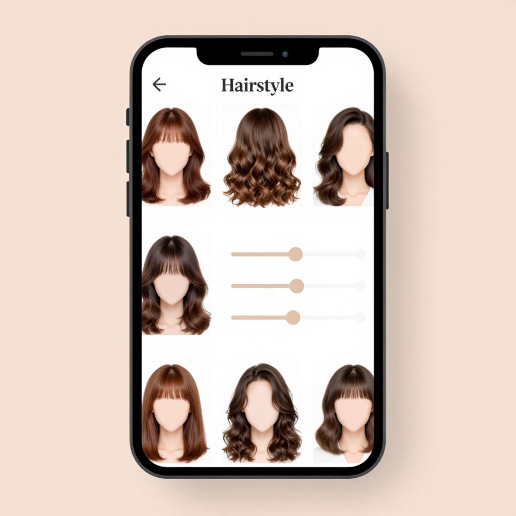 Hairstyle tester app displaying multiple layered hairstyle options inside a modern smartphone frame, soft pastel backgrounds, elegant UI with sliders for adjusting hair length and volume, realistic hair texture rendering, digital illustration