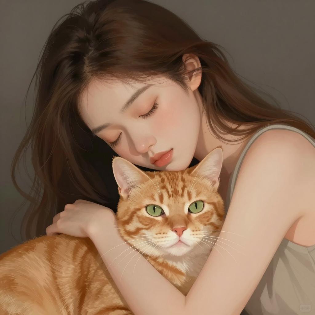 Digital illustration of a young woman with light brown slicked-back hair, eyes closed, and head tilted back. She is wearing a yellow tank top with a blue floral pattern. A brown tabby cat with closed eyes rests its head on her shoulder. Both subjects display peaceful expressions against a neutral beige background.