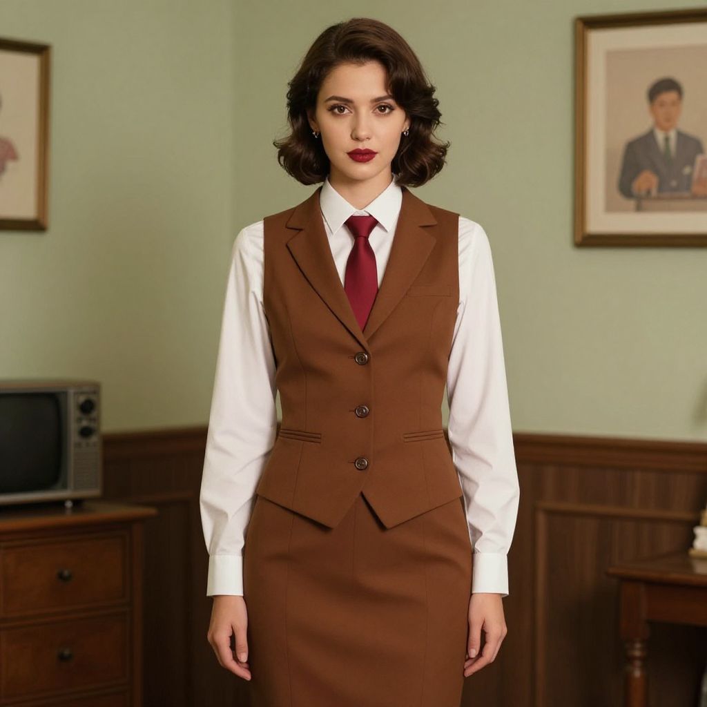Photograph of a dark-haired woman with red lipstick, wearing a brown vest and skirt over a white shirt with a red tie, standing in a vintage