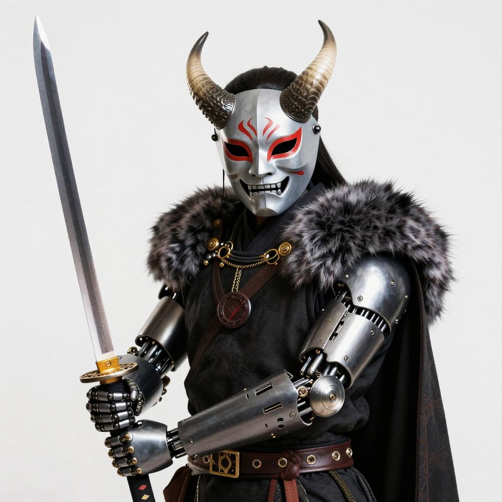 Photorealistic, (hyperrealistic:1.2), beautiful, masterpiece, best quality, perfect lighting, derpd, mask, horns, cloak, faceless, katana, holding sword, fur trim, mechanical arms