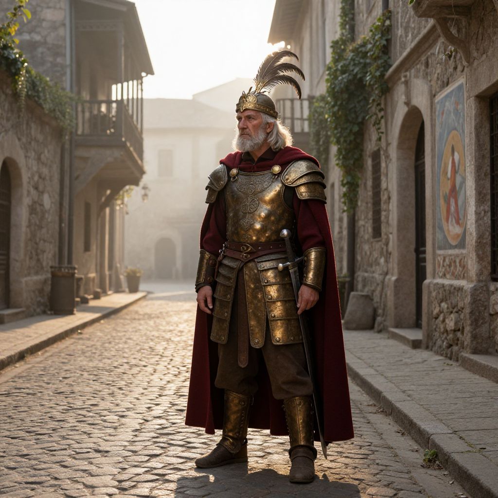 A tall, stoic man in ancient armor stands on a cobblestone street, his bronze and leather armor weathered by time, adorned with intricate engravings and a ceremonial headdress made of gold and feathers. He wears a cloak of deep red wool tied at the shoulders, and carries a curved sword at his side. His face is weathered with age and wisdom, eyes sharp and focused, as he surveys the scene. The cobblestone street is lined with ancient stone buildings, their walls cracked and draped with ivy, with narrow alleyways and faded frescoes on the sides. A soft golden dawn light filters through the misty air, casting long shadows across the street, evoking a sense of history and quiet strength. The atmosphere is timeless and mysterious, blending realism with a touch of fantasy.