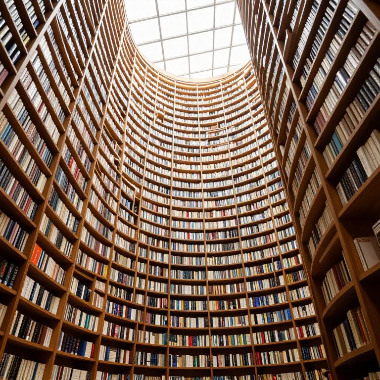 Spiraling shelves ascend endlessly toward a radiant skylight, illuminating rows of books that stretch into the infinite depths of this ethereal library.
