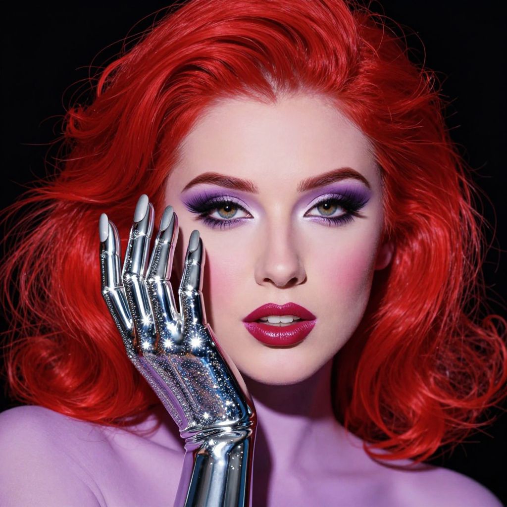 Photograph of a fair-skinned woman with vibrant red, wavy hair against a black background. She has striking purple eyeshadow, thick eyeliner, and bold red lipstick. Her right hand, which is metallic and robotic with reflective silver surfaces, is raised to her face, partially covering her left cheek. She gazes directly at the camera with a slightly open mouth, showcasing a futuristic, cybernetic aesthetic. The image emphasizes contrast between her natural features and the synthetic hand, creating a striking visual effect.