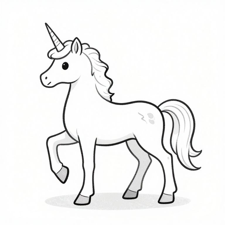 Black-and-white line drawing of a cute, cartoon-style unicorn with a single horn, fluffy mane, and tail, standing on three legs.