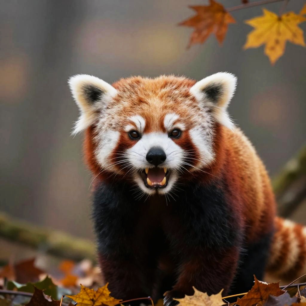Red panda intimidating expression, teeth bared and ears back, amidst misty autumn woodland, soft sunlight filtering through colorful leaves, photorealistic style with emphasis on texture and emotion, atmospheric composition.