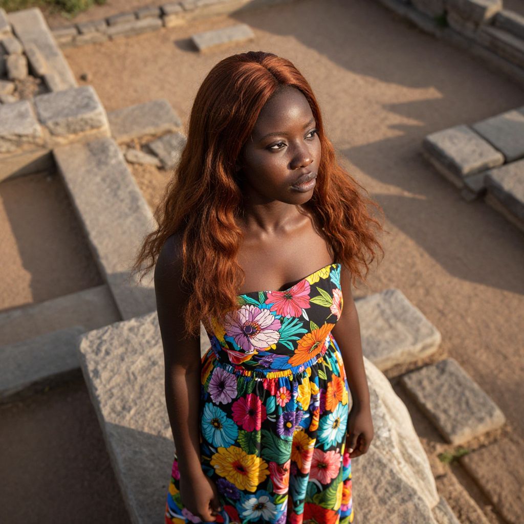 Photograph of a young Black woman with long, wavy auburn hair, wearing a colorful floral dress, standing among ancient stone ruins in sunlight