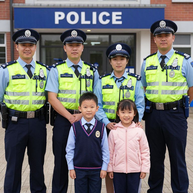 Photograph of five police officers and two children standing in front of a police station. Four male officers, wearing light blue shirts, dark blue pants, and bright yellow high-visibility vests with police badges, stand behind two children. The boy, in a navy sweater vest, light blue shirt, and tie, stands in front of the second officer, while the girl, in a pink jacket and dark pants, stands in front of the third officer. The officers have dark blue police caps with white checks. The background shows a brick building with a blue and white "POLICE" sign above a glass door. The image has a bright, daytime setting.