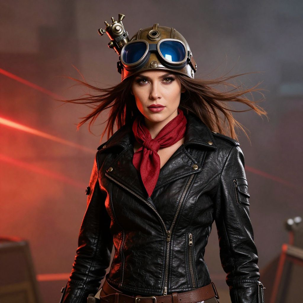 Photograph of a fierce woman in black leather jacket, red scarf, and steampunk goggles with a gear on her head, set against a sm