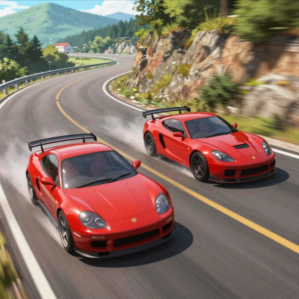 Red car anime, intense street race scene with two red cars zooming on a twisting mountain road, sharp angles and exaggerated motion lines, dynamic perspective, bright color palette with red dominance, anime-style speed effects and detailed car designs