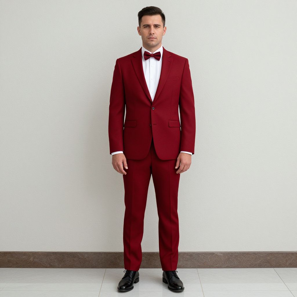 "Stylish Dress Man Wedding, man in a red suit and bow tie standing in front of a wall"