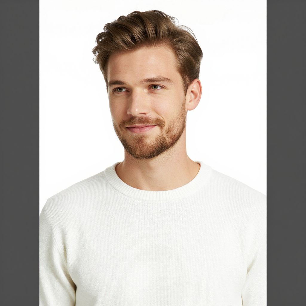 Photograph of a young white man with light skin and brown hair, styled neatly with a short beard and mustache. He's wearing a plain white, slightly textured sweater. He's looking slightly to the left with a subtle, relaxed smile. The background is plain white, making him stand out prominently. The image has a gray border on both sides.