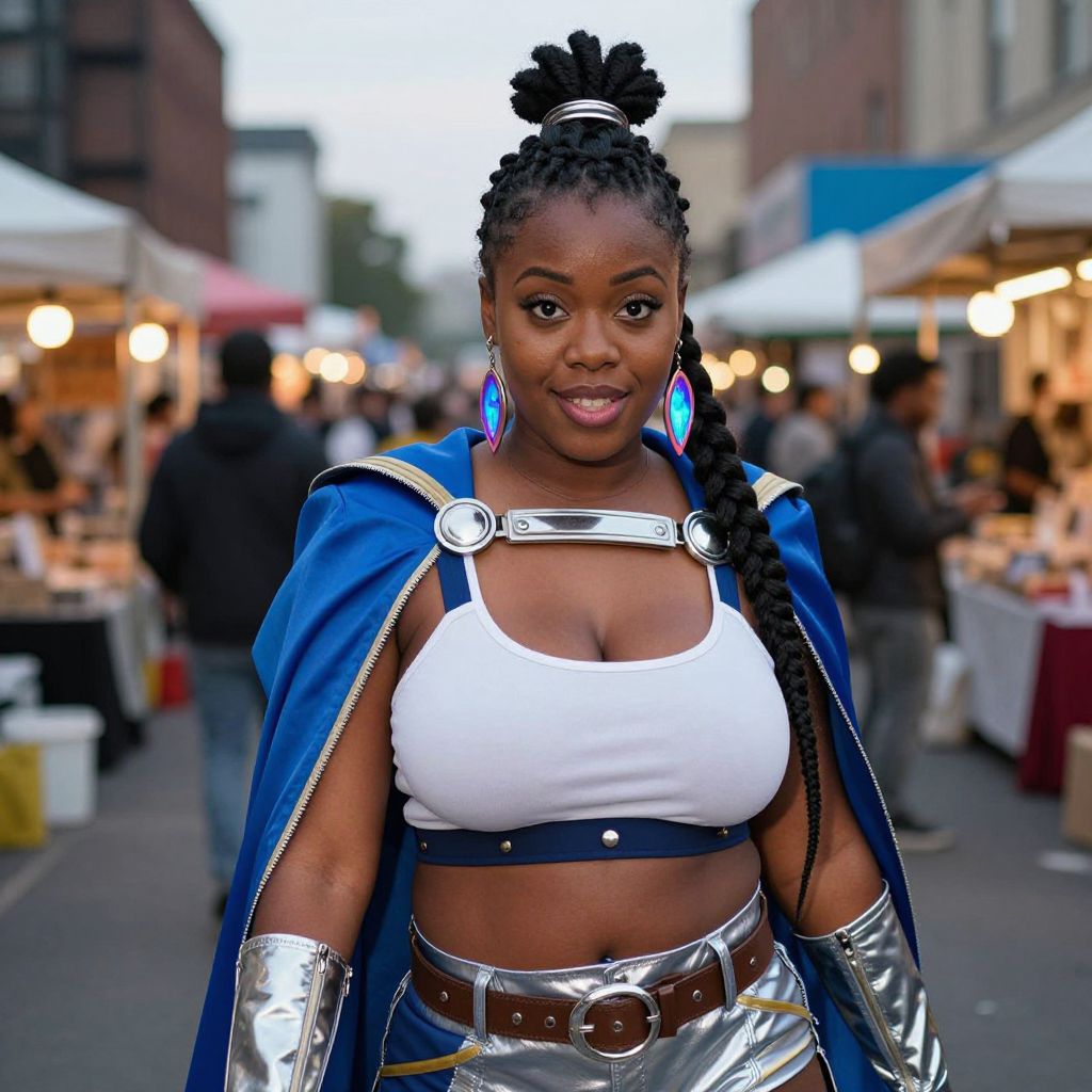 A bold, confident African-American woman with a high, textured fishtail braid incorporated into a trending modern hairstyle, dressed in a dynamic, cosplay-style costume combining streetwear and fantasy elements—blue capes, metallic boots, and glowing earrings—standing in a bustling urban market at dusk, her face bright and expressive with a playful smirk.. The woman has big breasts and cute face