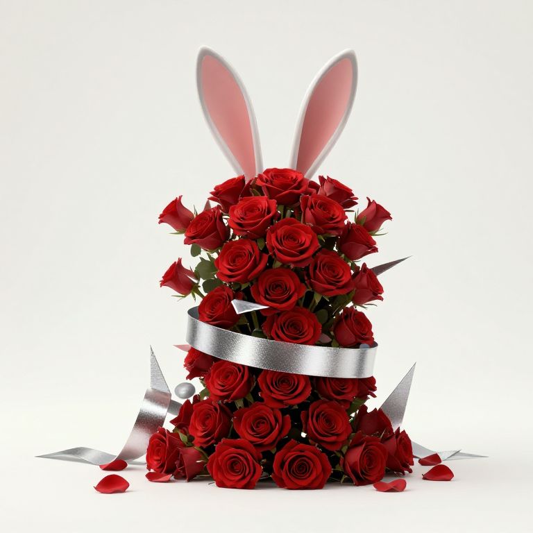 Character edgy sharp unexpected stunning easter display commercial editorial modern flowers red roses silver ribbon sharp very pale background angular cyber details clear electric easter fashion,