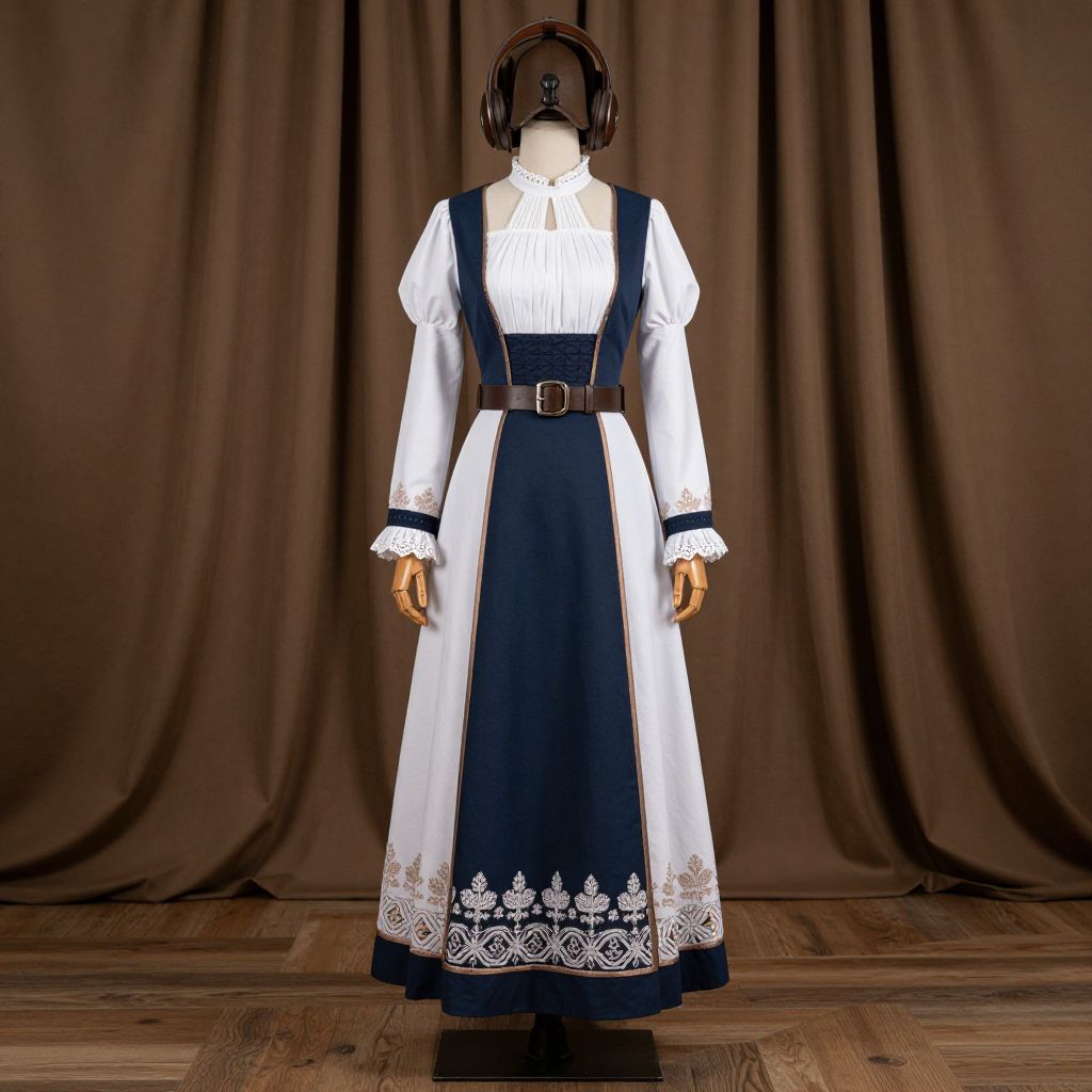 Photograph of a mannequin in a medieval-style white and navy dress with lace trim, brown belt, and wooden floor, against brown draped fabric