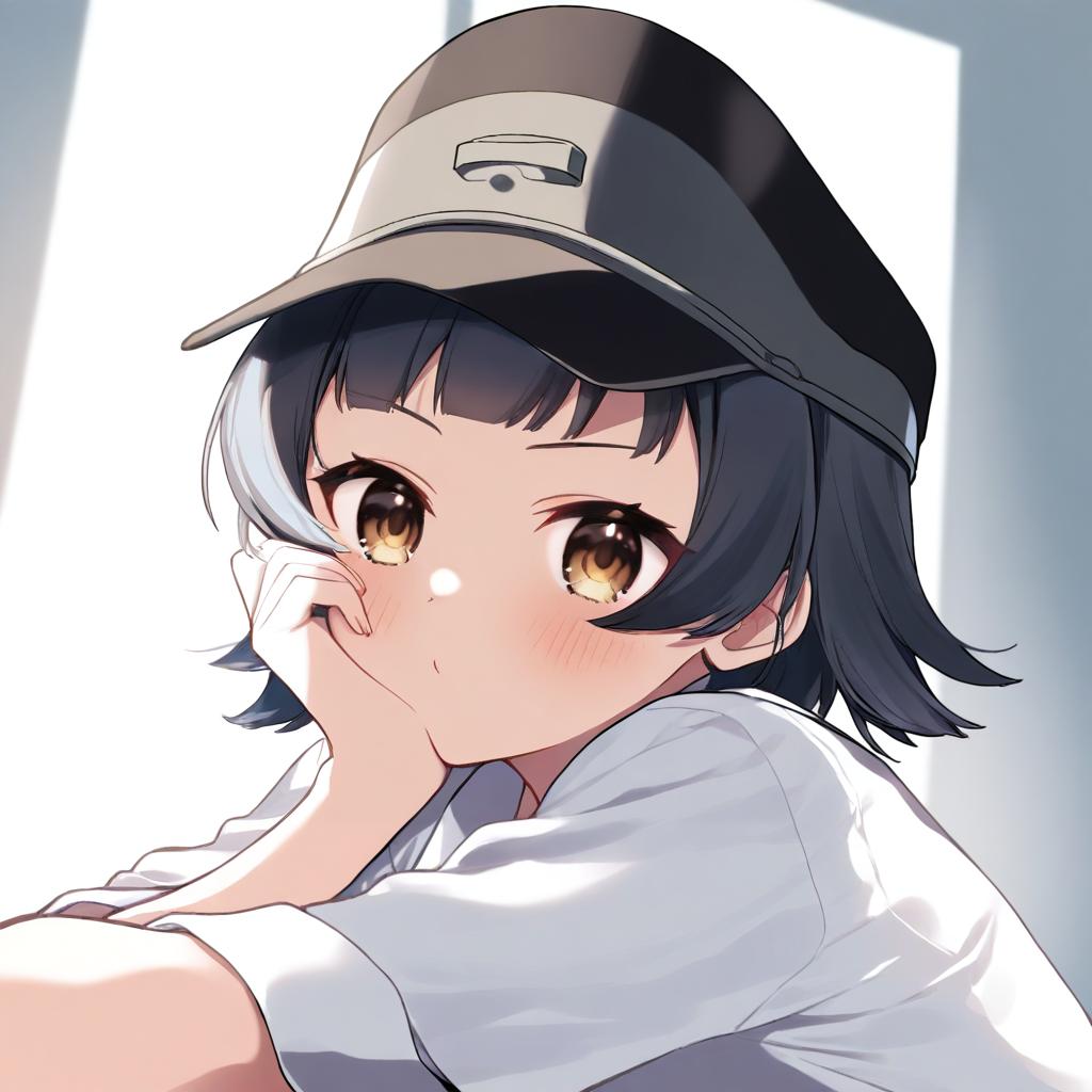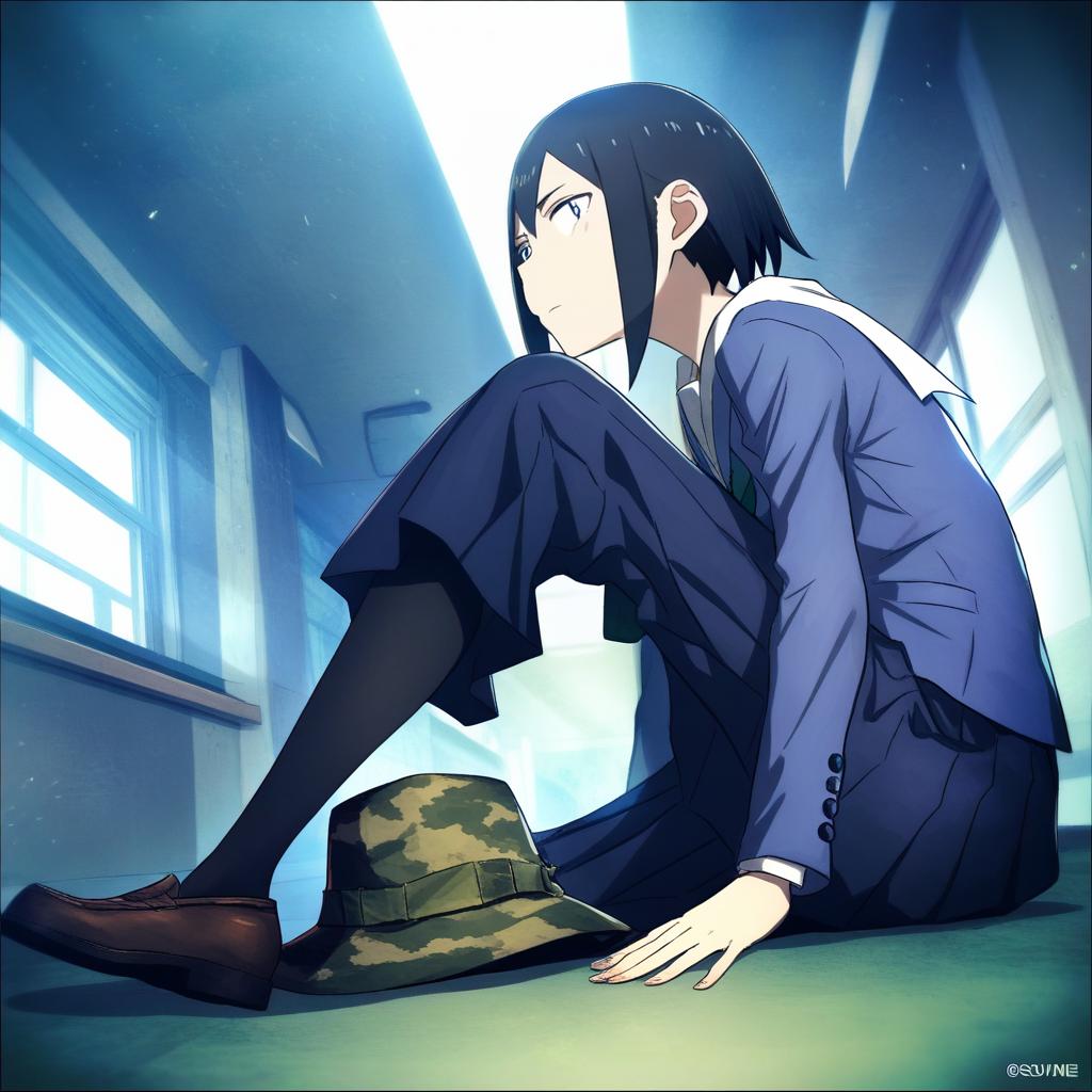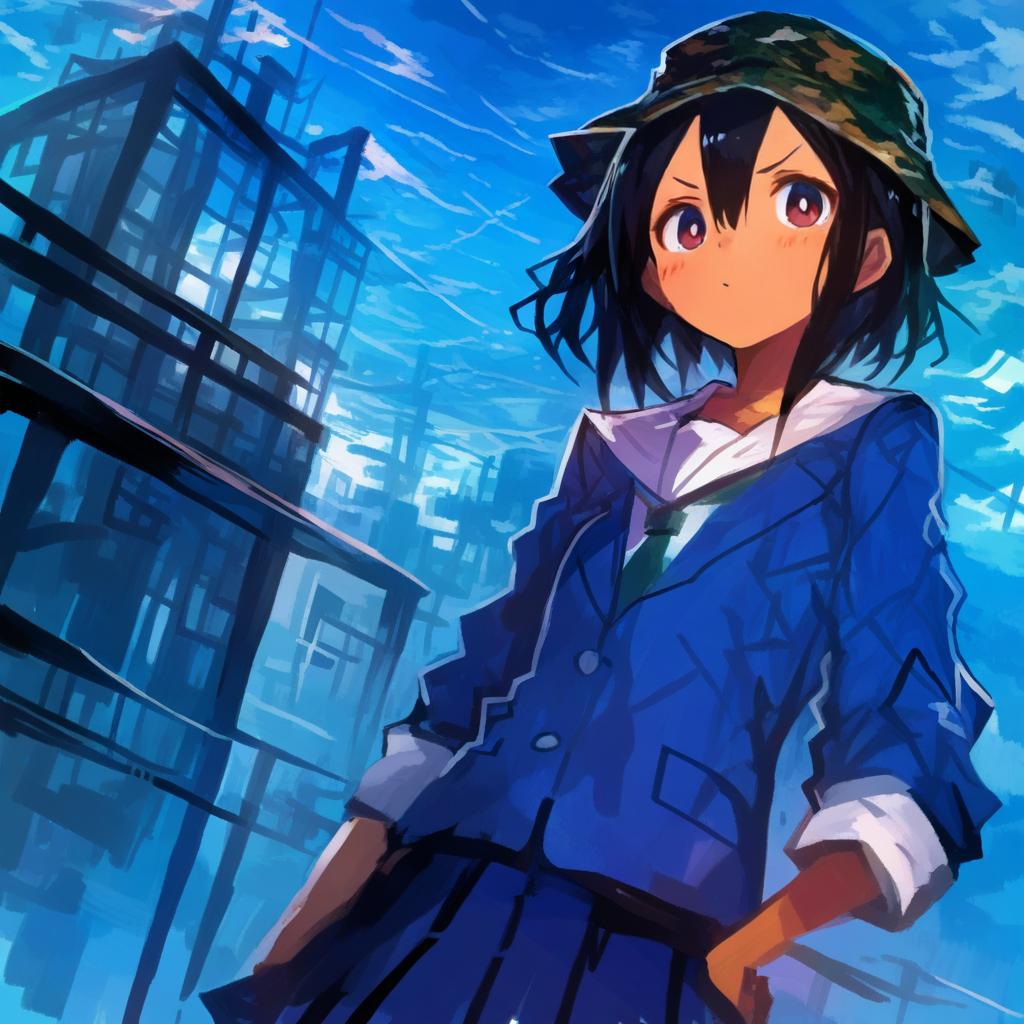 Asakusa midori, eizouken ni wa te wo dasu na!, 1girl, black eyes, hair between eyes, short hair, black hair, school uniform, school uniform, blue jacket, blue skirt, pleated skirt, bucket hat, camouflage headwear, long sleeves, by artist kotobuki (tiny life), illustrious