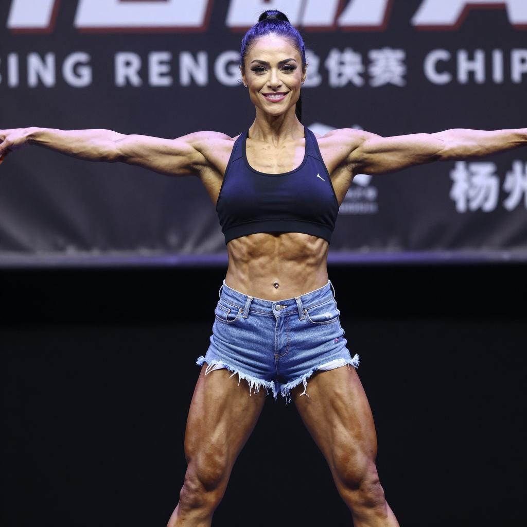 Full body portrait of fit woman with sixpack abs and powerful muscular physique, wearing simple black sports bra and frayed blue jean shorts on woman with braided ponytail, heavy muscle definition, and relaxed smile posed lat spread pose, elbows out, lats flared wide in dark stage-style backdrop with faint competition banners under cool-toned lighting to emphasize veins and striations, intense bodybuilding photography, high resolution, ultra-detailed
