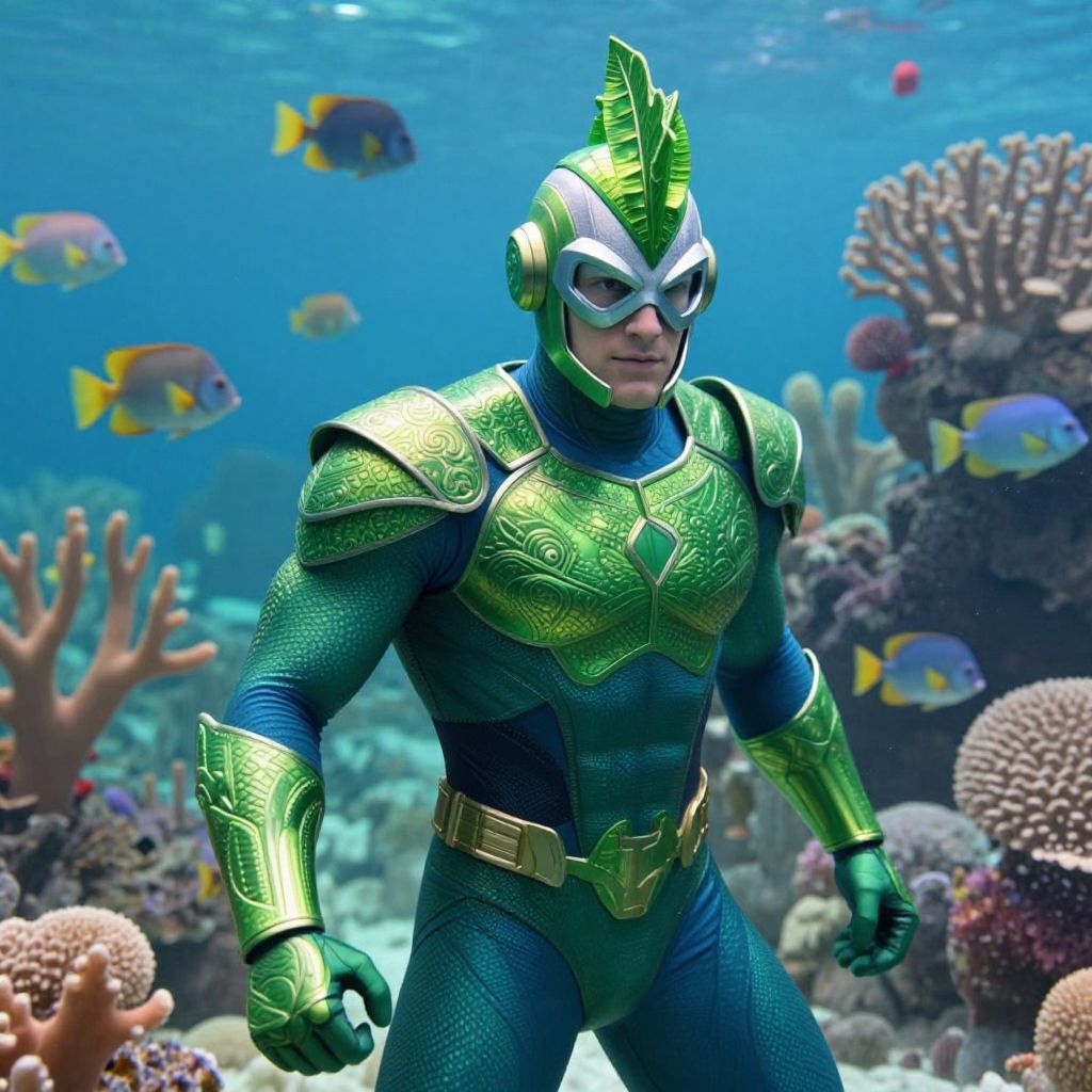 In this captivating underwater scene, a superhero in a vibrant green and blue costume, reminiscent of Aqua Man, is the central figure. His armor is detailed with intricate designs and textures, blending seamlessly with the aquatic environment. The superhero's helmet is adorned with a green, leaf-like crest, adding a touch of nature to his mechanical appearance. Surrounding him are various fish, each with distinct colors and shapes, swimming peacefully in the background. The underwater setting is rich with coral and aquatic plants, creating a lush, vibrant ecosystem. The overall composition is dynamic, with the superhero positioned in the foreground, his body slightly angled to the viewer, while the fish and coral form a layered backdrop, enhancing the depth and complexity of the scene. The interplay of light and shadow, along with the soft, natural colors, contributes to the epic and cinematic atmosphere of the image.