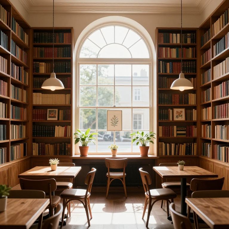 Cozy library bathed in natural light streams through a large arched window, flanked by wooden bookshelves filled with rows of vintage books, with tables and chairs arranged symmetrically beneath hanging pendant lights, surrounded by potted plants and framed floral artwork.