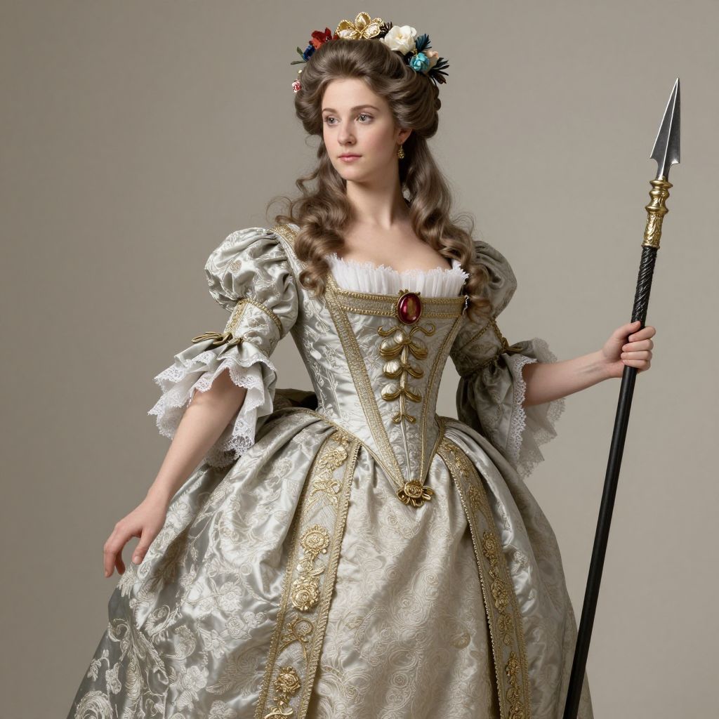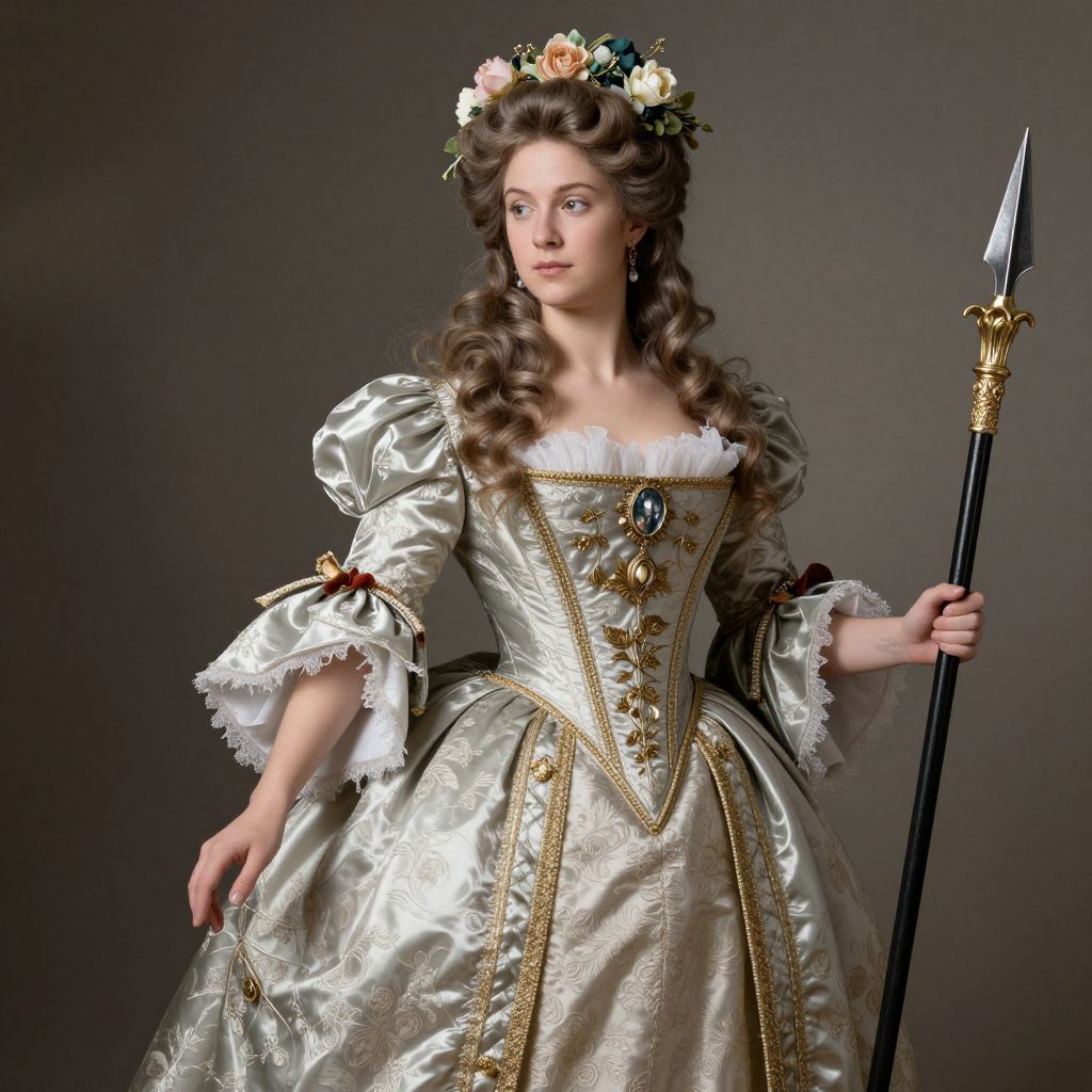 Photograph of a young woman in an elaborate, silver and gold baroque-style dress with lace trim, holding a spear, adorned with a floral crown
