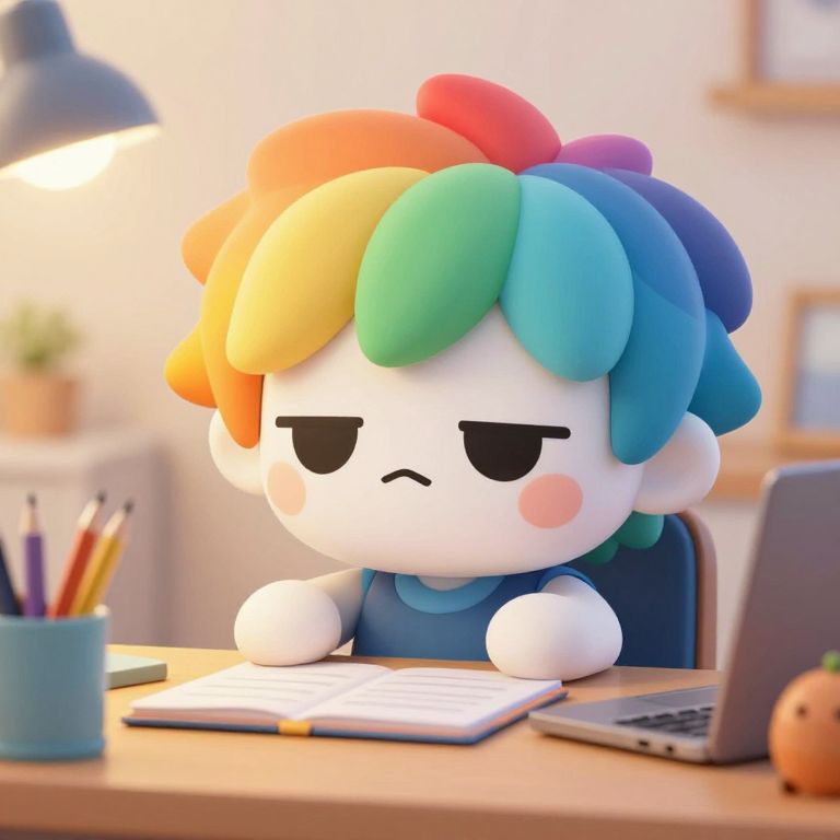 A cute, stressed-looking creature with colorful hair sits at a desk surrounded by pencils and a small toy, suggesting a work environment.