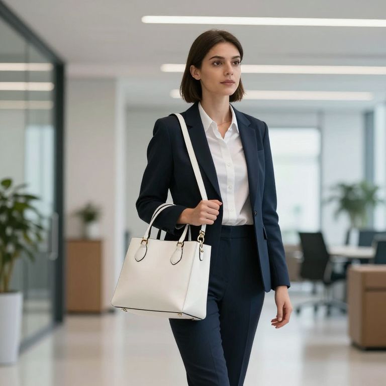 A young professional in her 30s with brown eyes and a neutral face walks through a modern office building lobby, carrying a refined white shoulder bag with a delicate strap, the bag catching the fluorescent lights and ambient daylight in a clean, minimalist interior.