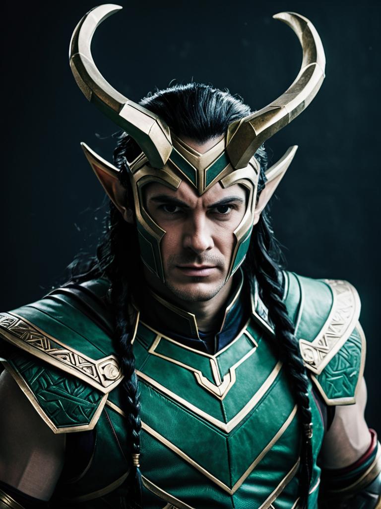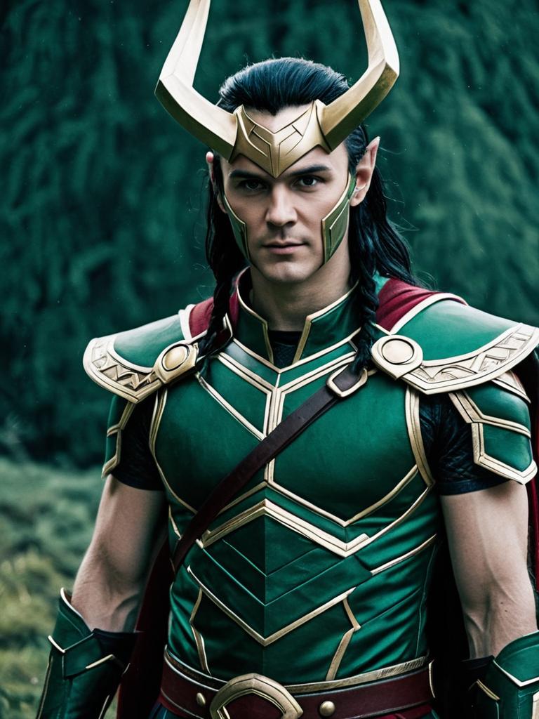 Portrait of a man wearing an old Loki costume featuring dark green and gold armor, a red cape, and prominent curved horns. The man has long black hair and a serious expression, standing outdoors with a blurred natural background.
