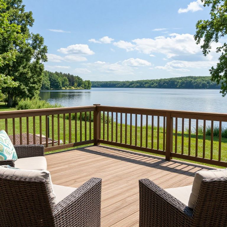 Photograph of a sunny lakeside deck with wicker chairs, white pillows, wooden railing, lush green trees, and calm water.
