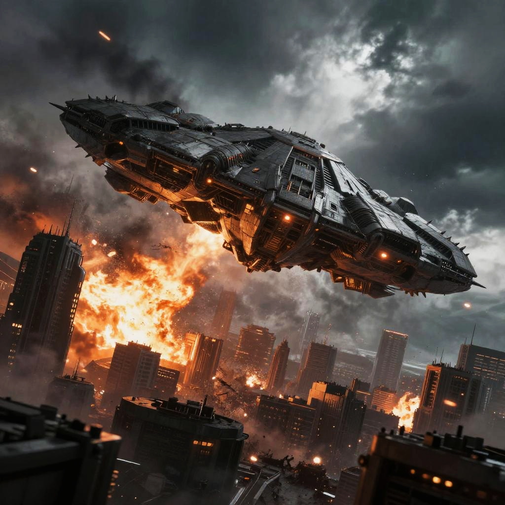 Evil spaceship attacking a futuristic city, chaos and destruction below, dark sleek vessel with spiked edges, fiery explosions lighting up a stormy sky, dramatic action scene