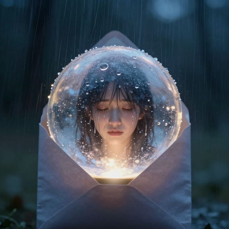Enveloped in the quiet embrace of falling rain, the luminous sphere cradles a universe of frozen emotions—each droplet a whisper of laughter, a tear of grief, and a lullaby of untold stories, inviting contemplation of the transient beauty within the eternal cycle of life.