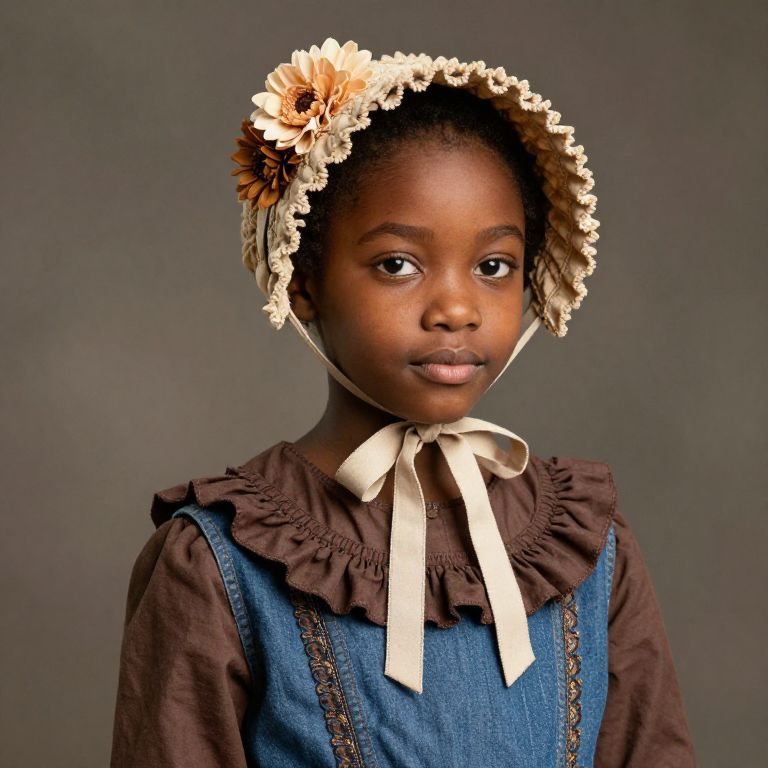 Female black girl wearing a blue and brown dress with a brown ruffled collar and a beige bonnet with a flower on the top.