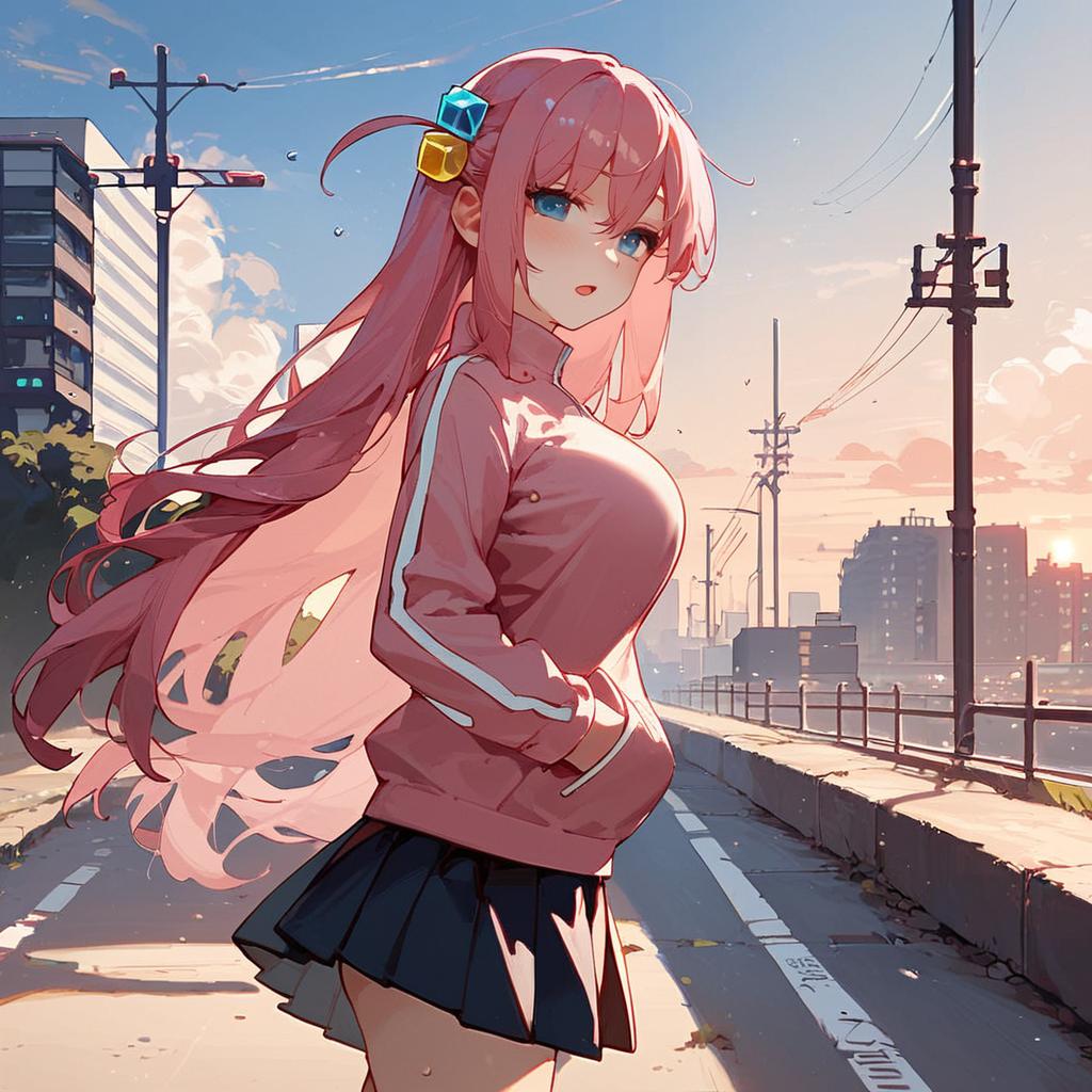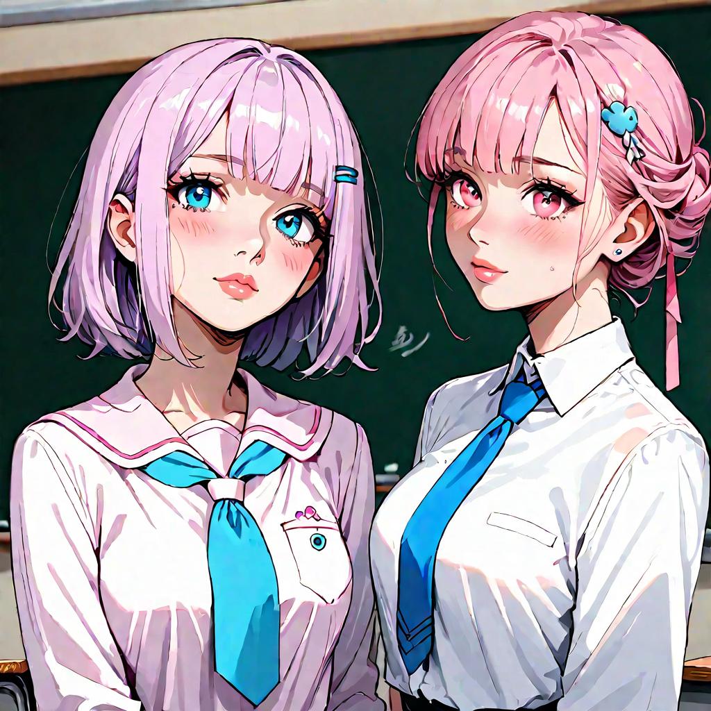 Score_9, score_8_up, score_7_up, source_anime, ninonakano, nino nakano, short hair, bangs, blue eyes, hair ornament, hair ribbon, pink hair, blunt bangs, two side up, butterfly hair ornament, mature female, skirt, shirt, long sleeves, white shirt, pleated skirt, open clothes, collared shirt, sleeves past wrists, dress shirt, cardigan, green skirt, open cardigan, black cardigan, crossed arms, indoors, classroom, looking at viewer, cowboy shot, dutch angle