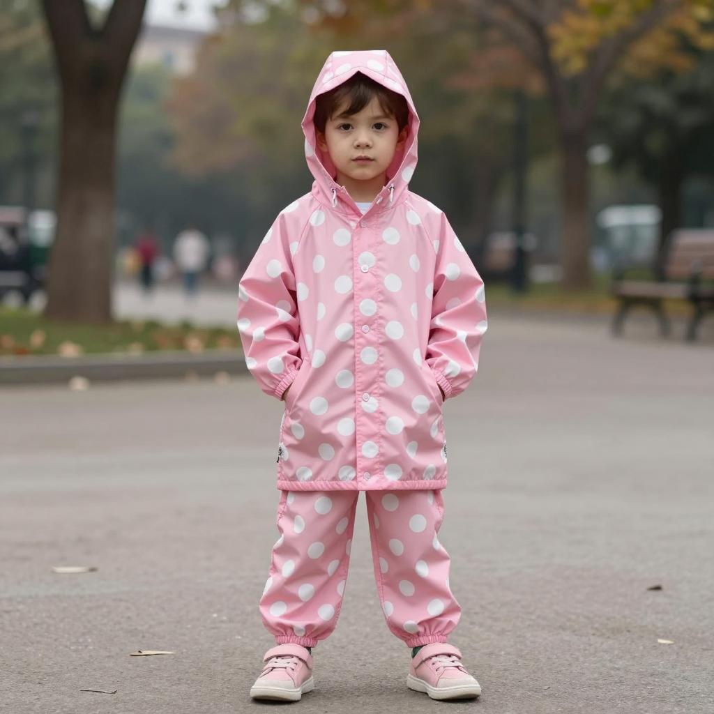 Photorealistic image of a young toddler standing in an urban environment during daytime. The baby wears a light green full zip hoodie with the hood up and matching pants, paired with white sneakers. The child has a serious expression, standing with hands relaxed by the sides. Soft lighting and a clear sky are visible with blurred buildings and trees in the background.