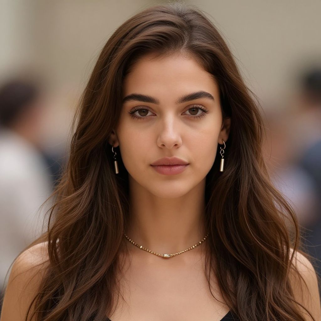 Photograph of a young woman with fair skin and dark brown hair in a high ponytail. She has striking, dark brown eyes with long eyelashes, and is wearing bold, silver hoop earrings and a sparkling silver necklace with a teardrop-shaped turquoise pendant. Her off-the-shoulder white top is adorned with subtle sequins. She has a neutral expression with slightly parted pink lips. The background is blurred, featuring dark vertical stripes against a beige wall, drawing focus to her. The overall style is modern and elegant.