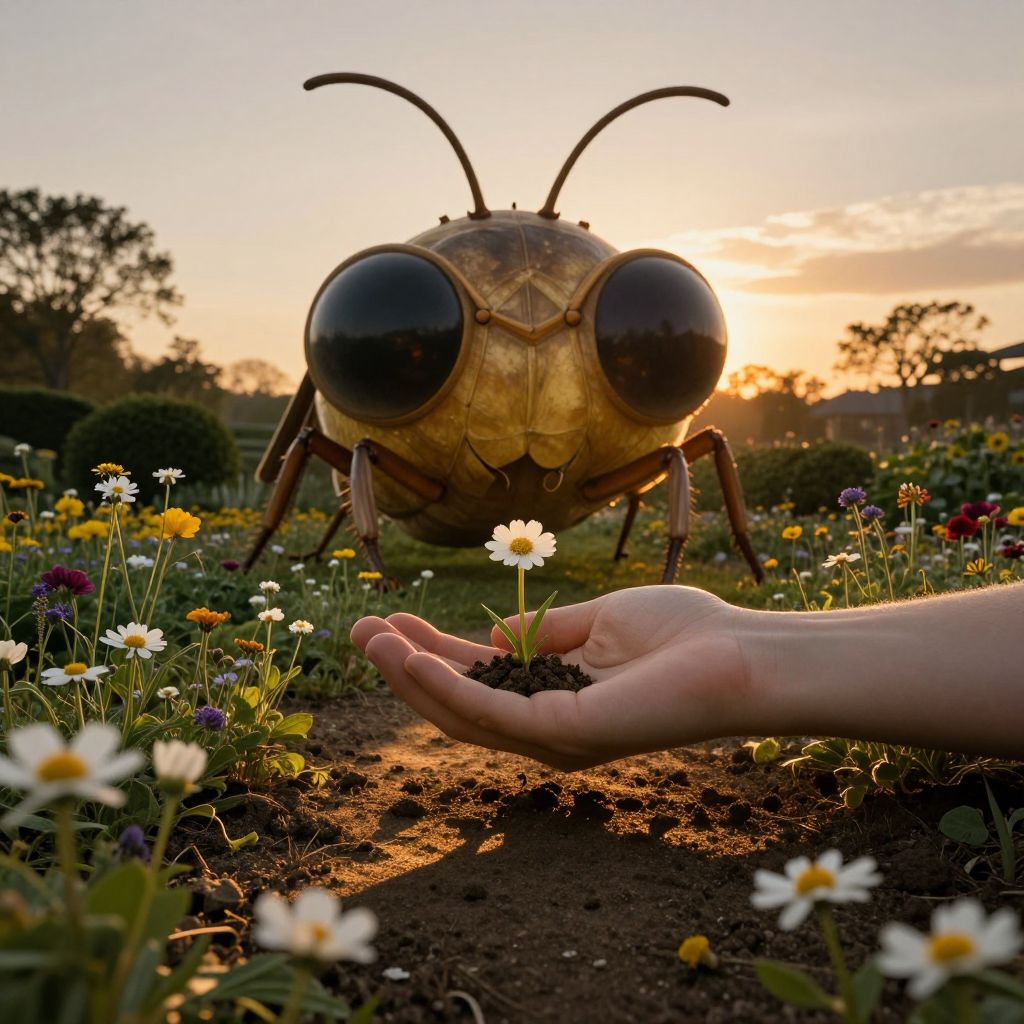 Photograph of a giant, realistic insect with large black eyes, standing in a sunlit flower garden, holding a tiny white daisy in a human