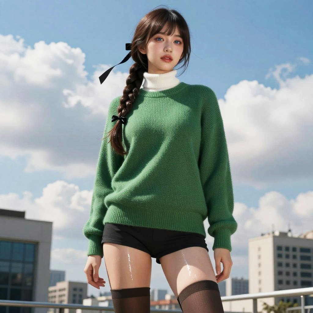(RAW, best quality:1.8, masterpiece:1.8), (realistic, photo realistic:1.8), ultra high res, UHD, high detail color photo, extremely detailed CG unity 8k wallpaper, absurdres, (realistic skin, transparent white glossy skin), (best shadow), (normal physical expression, perfect anatomy), (cinematic lighting), Moist eyes, Moist lips, 1girl, bangs, black ribbon, blue eyes, blue sky, braid, braided ponytail, breasts, brown hair, brown thighhighs, building, cameltoe, city, cloud, cloudy sky, cowboy shot, day, from below, green sweater, hair ribbon, long hair, long sleeves, medium breasts, outdoors, ribbed sweater, ribbon, shiny, shiny hair, single braid, sky, solo, standing, sunlight, sweater, thighhighs, thighs, (white turtleneck sweater, black skirt:1.5), window, looking at viewer, Bring your face forward, zoom in face