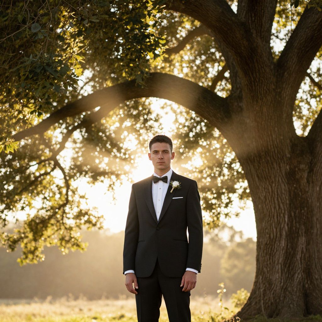 Photograph of a handsome man in a black tuxedo with bow tie, standing under a large tree at sunset, sunbeams filtering through leaves