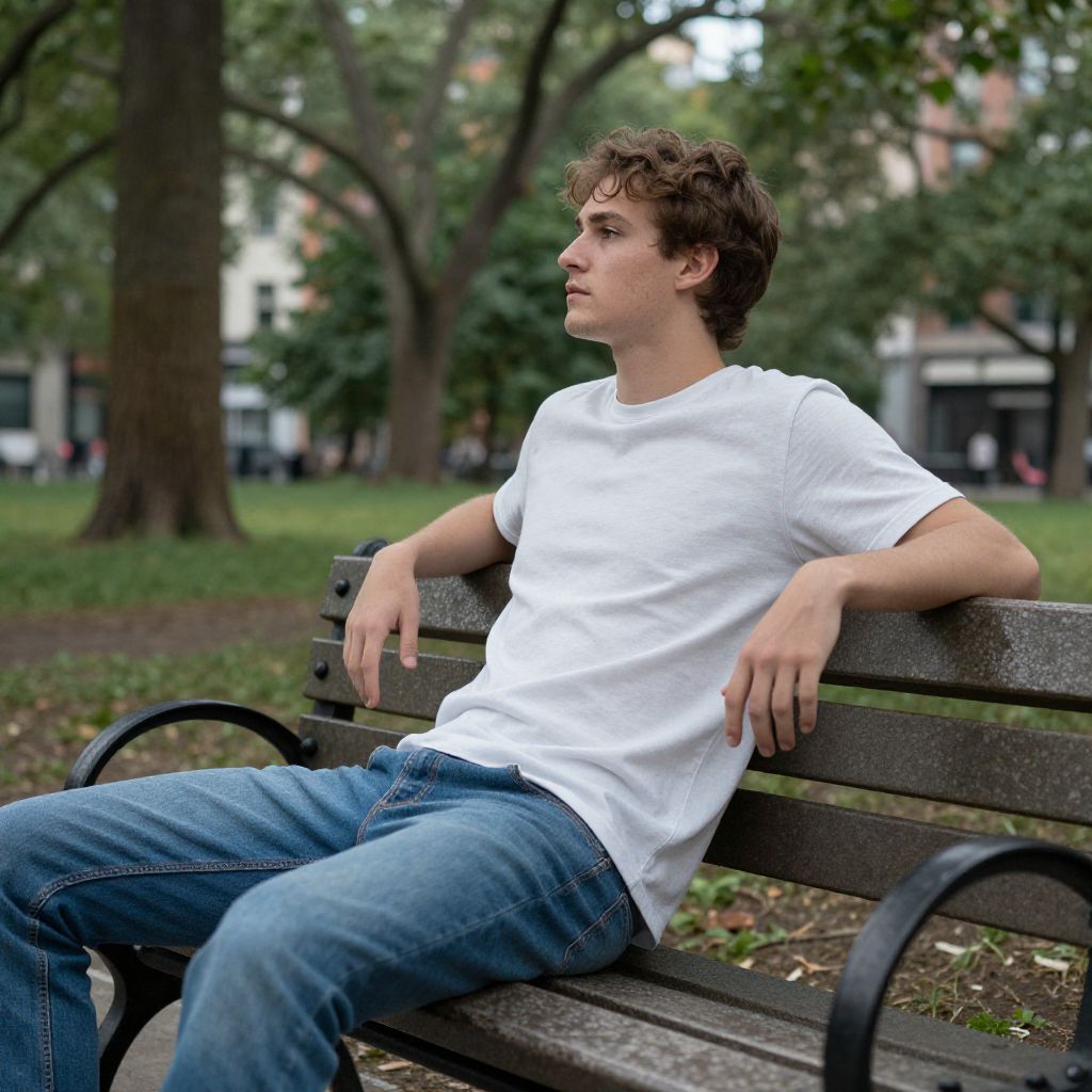 A casual young man spends a relaxing afternoon in a city park, dressed in a simple yet stylish t-shirt and jeans, leaning against a park bench surrounded by trees.
