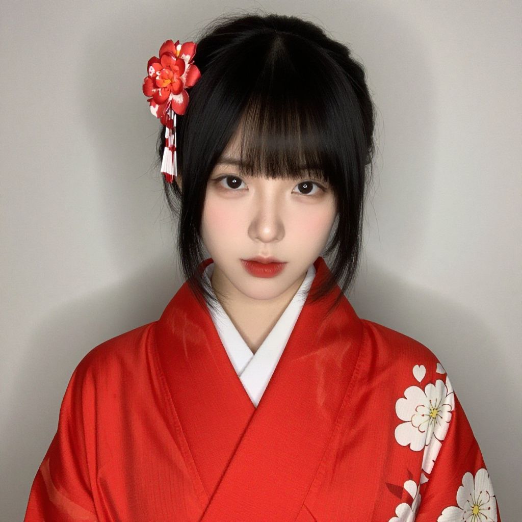 Photograph of an East Asian woman with fair skin, black hair adorned with a red flower, wearing a vibrant red kimono with white floral patterns,