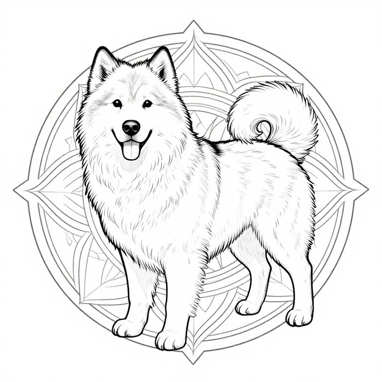 Black and white line drawing of a fluffy Shiba Inu with curled tail, standing on intricate geometric pattern background.