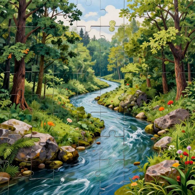 Piecey surreal landscape where natural elements such as trees, rocks, and rivers appear as segmented, puzzle-like pieces fitting together seamlessly, vibrant colors and dreamlike lighting blend reality and abstraction beautifully.