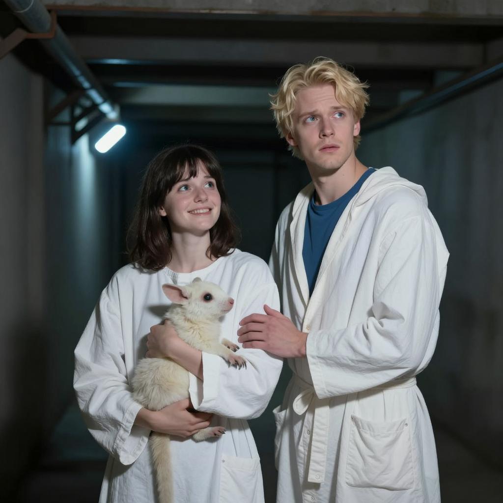Two people in a dimly lit, industrial tunnel. The person on the left has dark hair, wears a white robe, holds a small, pale animal, and looks up smiling. The person on the right has blond hair, wears a white robe over a blue shirt, grasps the left person's arm, and looks ahead with a concerned expression. Both are illuminated by faint blue lights, with metal beams and pipes on the walls.