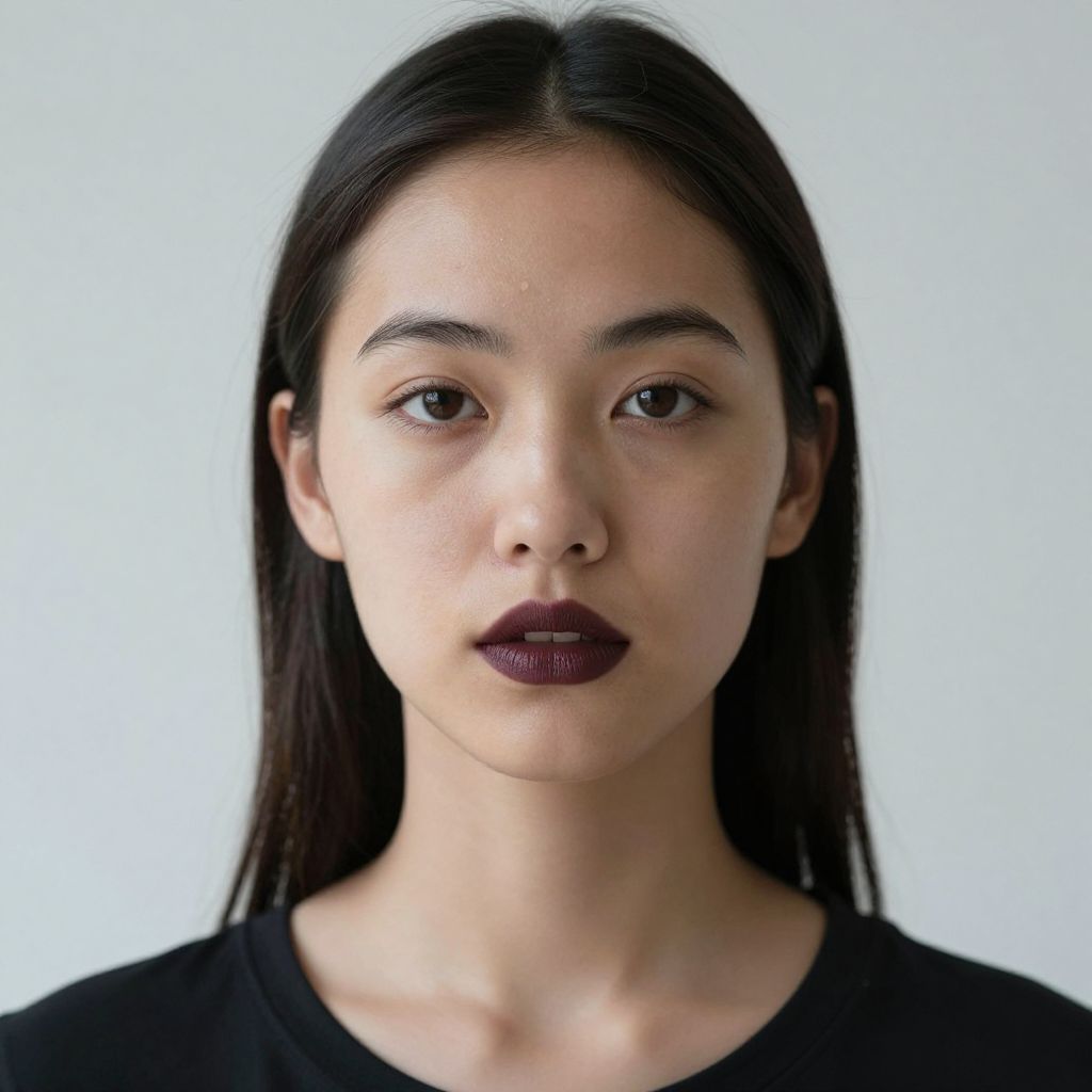 This is a photograph of an East Asian woman with straight, dark brown hair that falls to her shoulders. She has fair skin, dark brown eyes, and wears dark burgundy lipstick. She is looking directly at the camera with a neutral expression. She is dressed in a simple black top. The background is a plain, light gray, which contrasts with her dark hair and lipstick, making her face the focal point of the image. The lighting is soft and even, highlighting her facial features without casting harsh shadows.