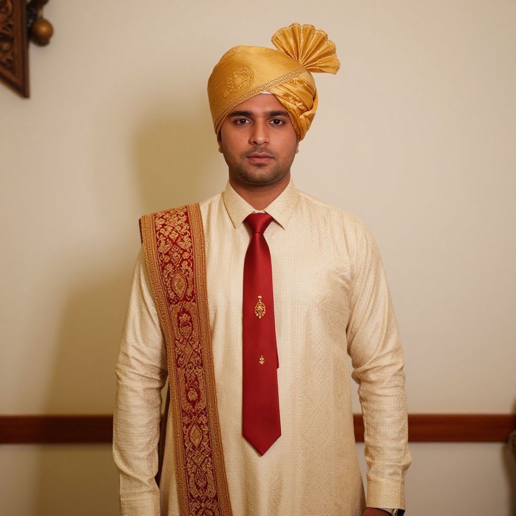 "Wedding Wear Man Indian, a man in a golden turban and red tie standing in front of a wall"