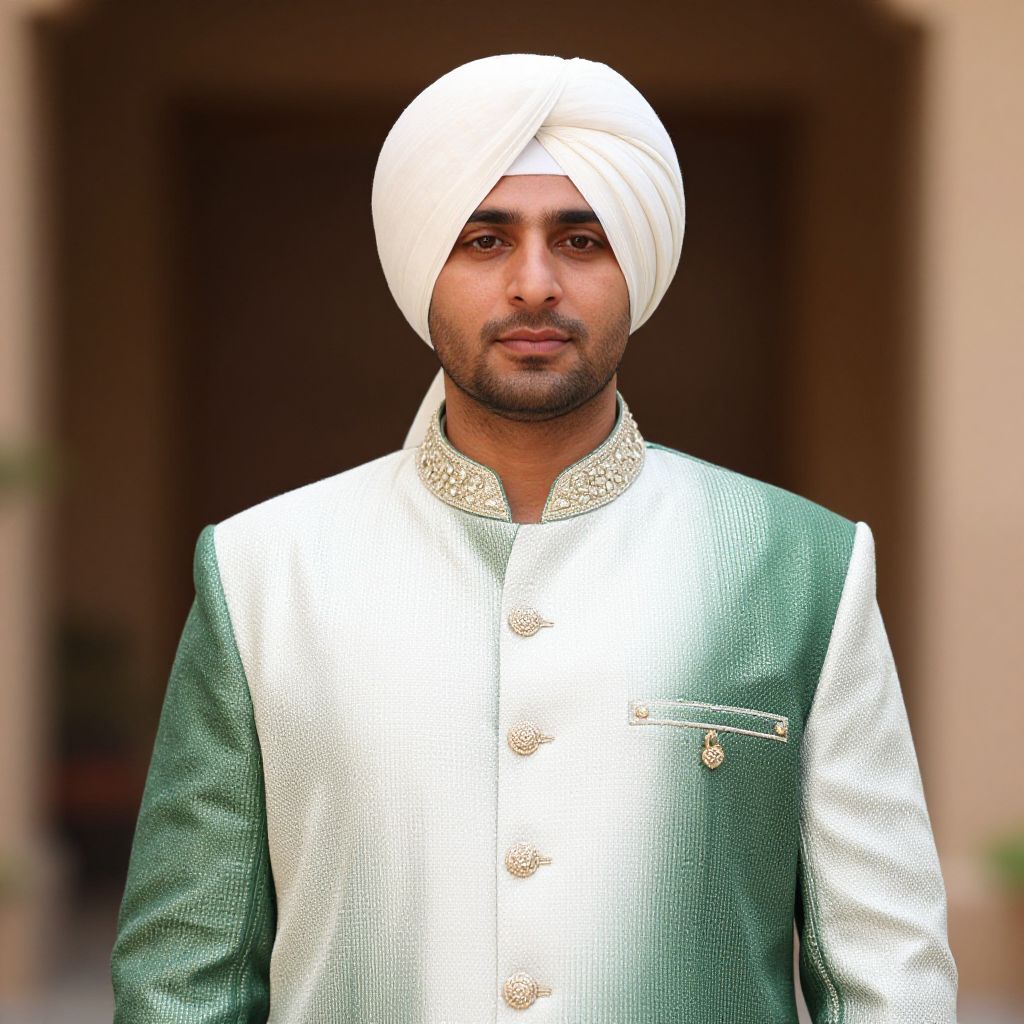 Photograph of an Indian man with medium brown skin, wearing a gold turban, white sherwani, red tie, and red patterned stole