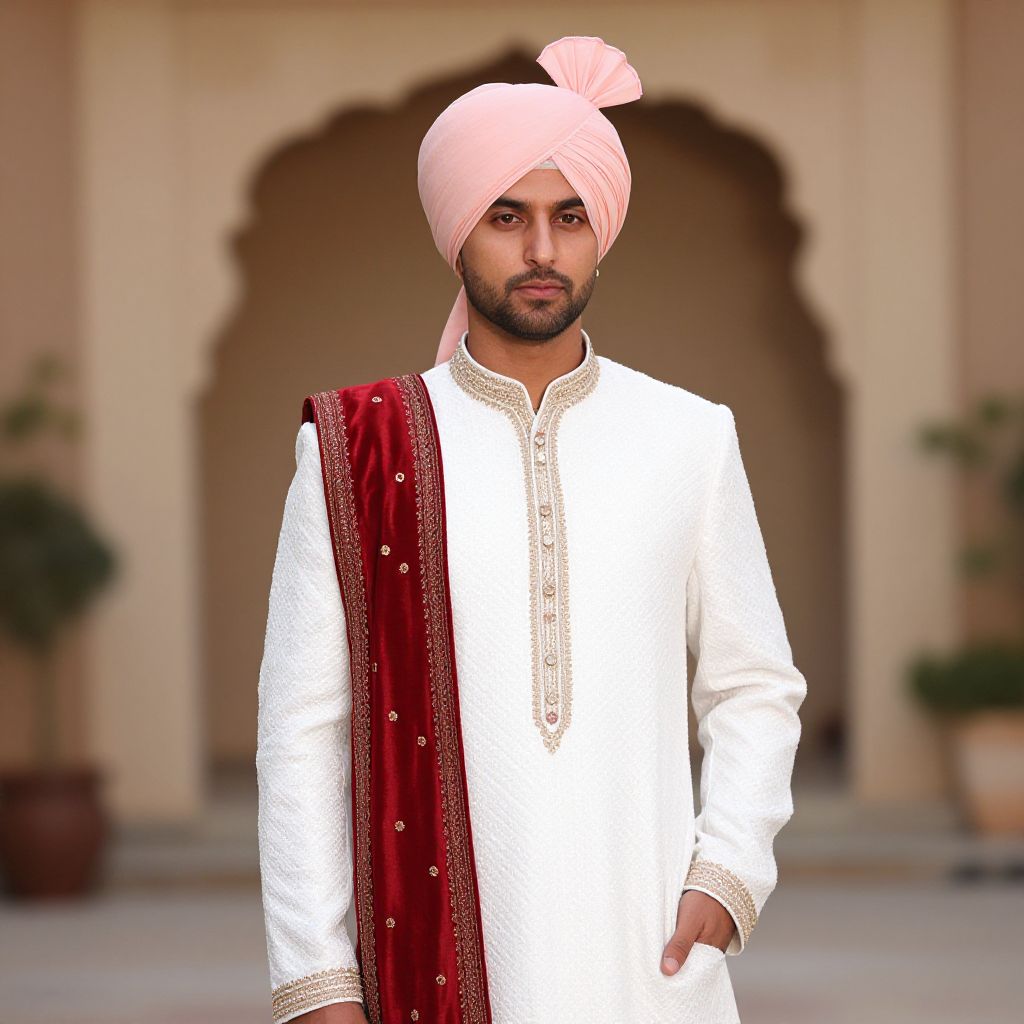 Photograph of a young South Asian man standing against a plain, cream-colored wall. He has a medium build, light brown skin, and short black hair. He wears a gold turban with a decorative pleat on top, a white embroidered kurta with intricate patterns, and a red tie with a small gold emblem at the collar. A red and gold embroidered shawl drapes over his right shoulder. His expression is neutral, and he stands with his arms relaxed by his sides. The background includes a wooden chair backrest partially visible at the bottom of the image.