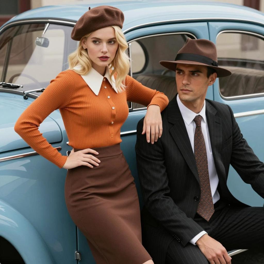 Two people in front of a blue vintage car. Blonde woman with light skin, wearing a brown beret, orange ribbed blouse, brown skirt, and white collar, leans against the car. Man with light skin, wearing a brown fedora, black pinstripe suit, white shirt, and patterned tie, sits on the car's step. Woman's right hand rests on her hip. Background includes reflections in car windows.