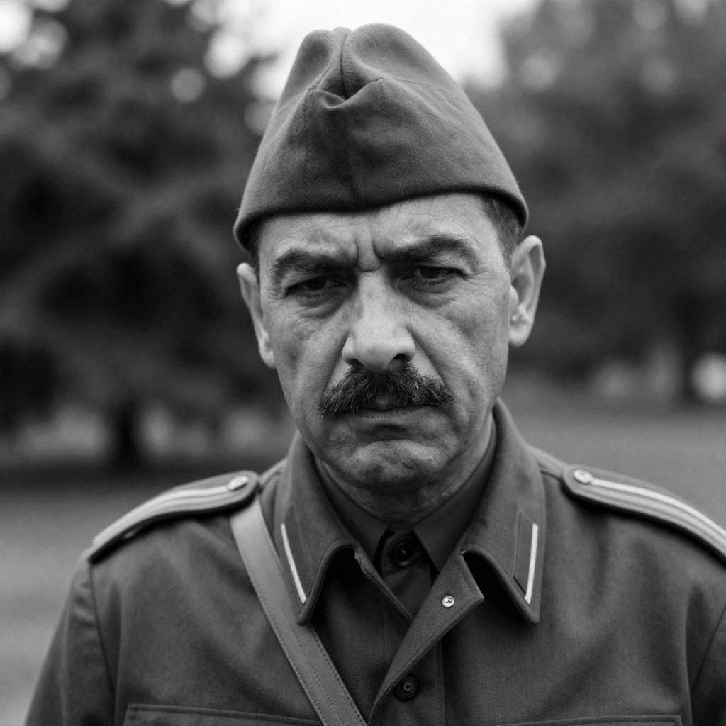 Photograph of a middle-aged man with a mustache, wearing a dark green military uniform, brown leather coat, and steel helmet. He has a serious expression and stands against a blurred, cloudy gray background. He is centered in the frame.