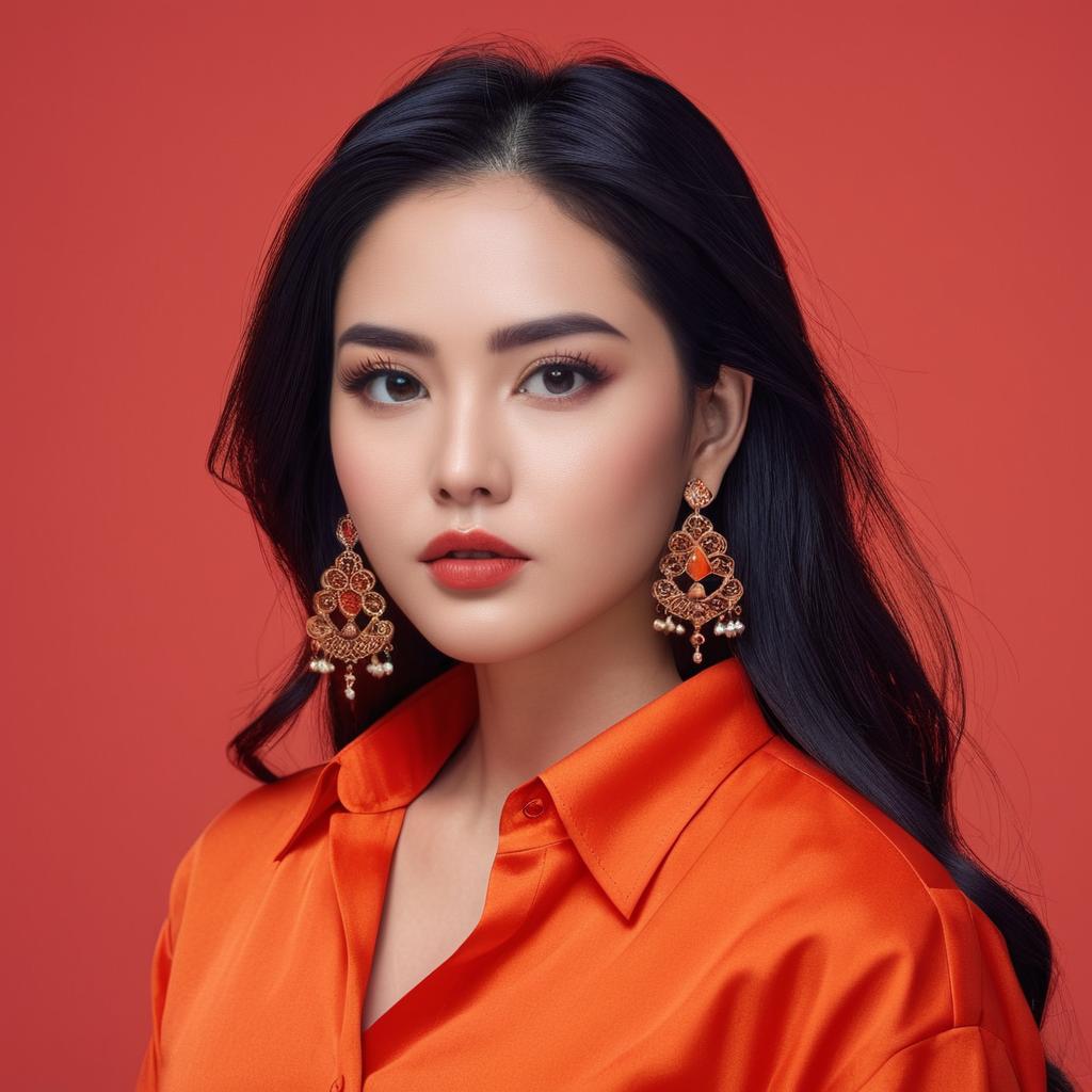 Portrait of an Asian woman with a softly braided hairstyle, wearing gold ornamental earrings and a matching necklace. She is dressed in a light blue top and has bold red lipstick, posing against an orange background.