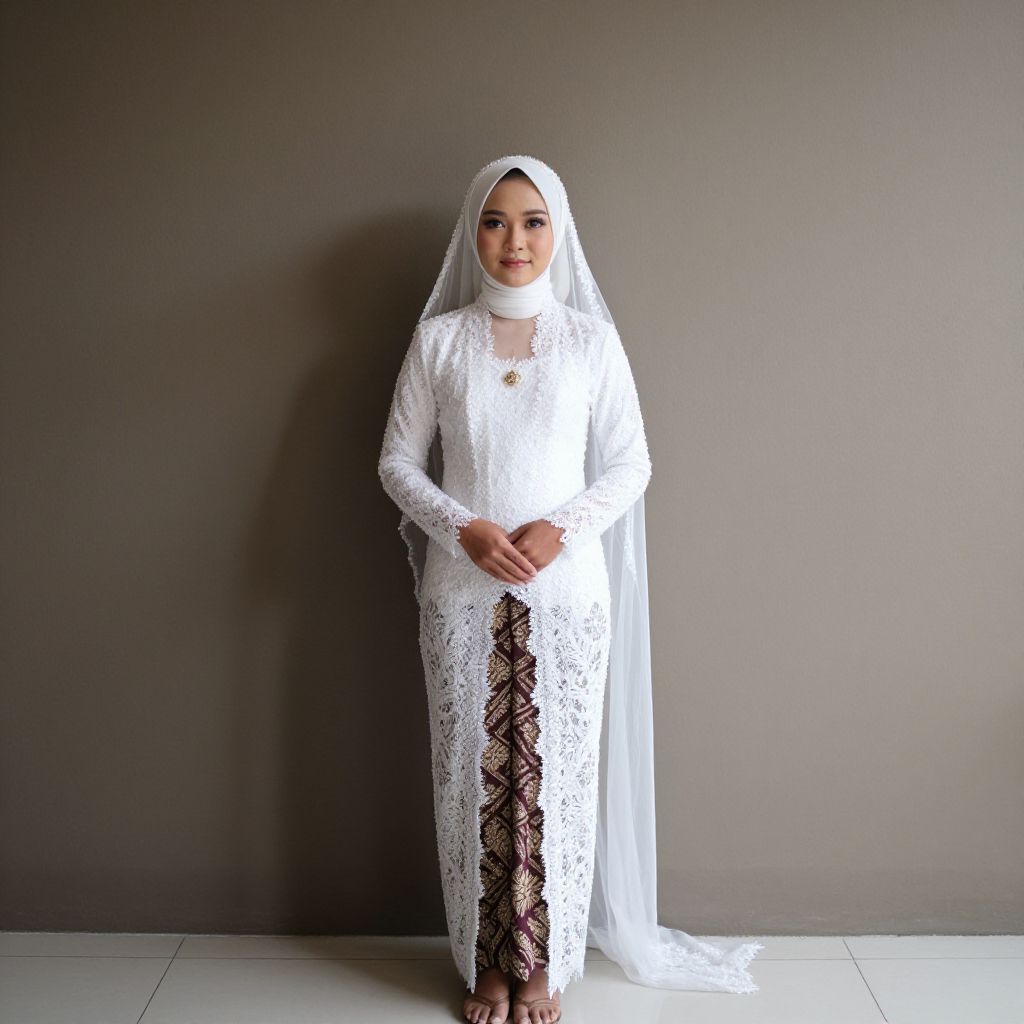 "Wedding Kebaya Modern, a woman in a white dress standing in front of a wall"